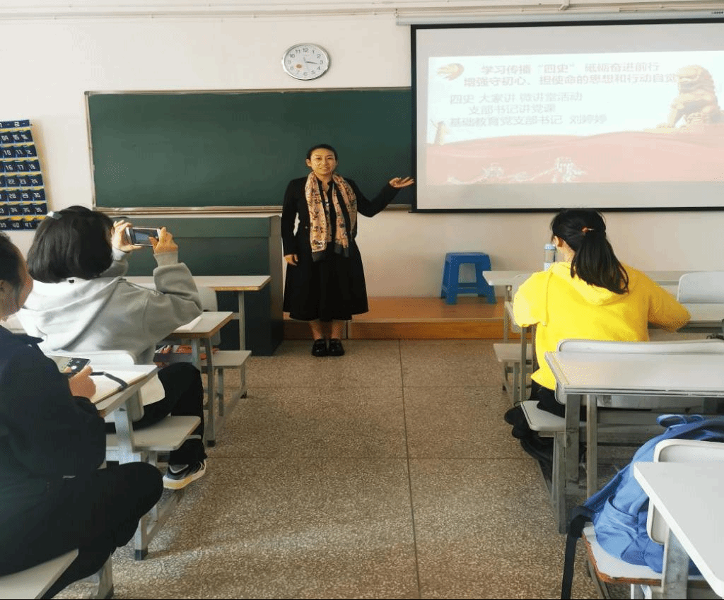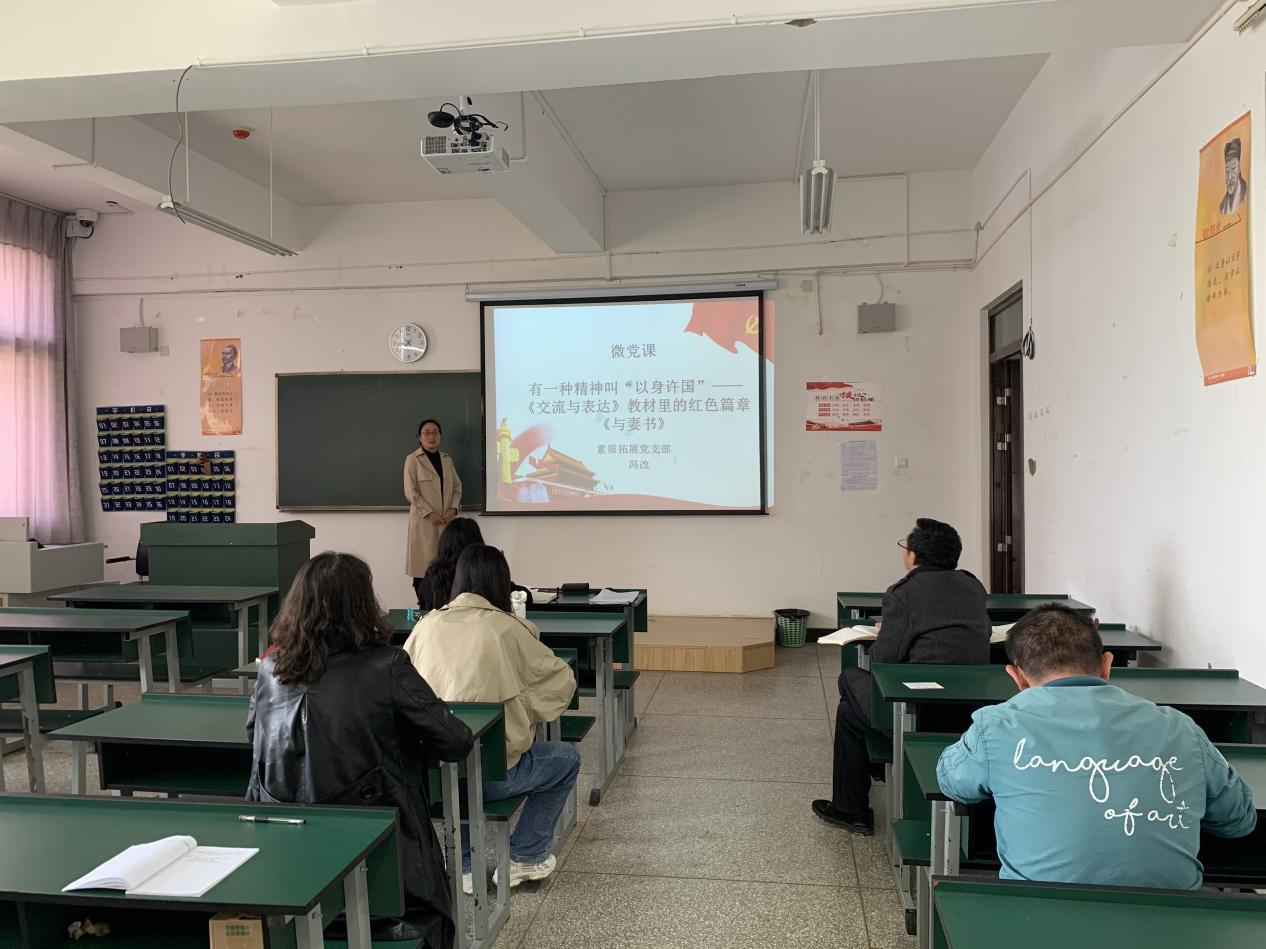 之后,各支部召开“三会一课”活动,素质拓展党支部书记冯改同志以有一种精神叫“以身许国”《交流与表达》教材里的红色篇章《与妻书》讲授微党课,基础教育党支部书记刘婷婷同志以《学习传播四史,增强守初心担使命,砥砺奋进前行》讲授微党课。各支部教师党员认真学习并记录党史学习教育专题党课学习笔记。