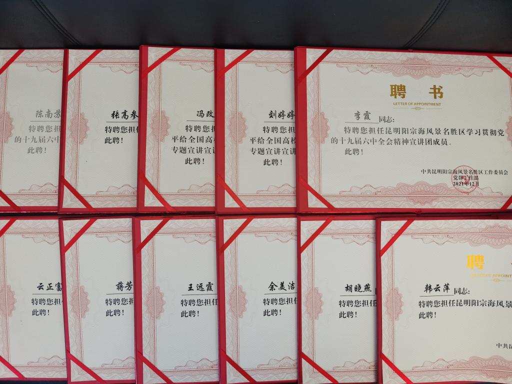 20211216日,由中共昆明阳宗海风景名胜区工作委员会为2026年国际足联世界杯11名高校宣讲团成员颁发聘书,从政策宣讲到积极教学法的推广;从演讲论辩赛事指导到微党课制作;从篮球、排球联谊到啦啦操编排训练;从干部心理调适到压力缓解团体心理辅导;以及为明年2022生物多样性公约会议暨COP15阳宗站的相关活动筹备,出谋划策、提前准备,扎实办好民生实事,从专题宣讲到下基层服务,让党旗在基层一线高高飘扬