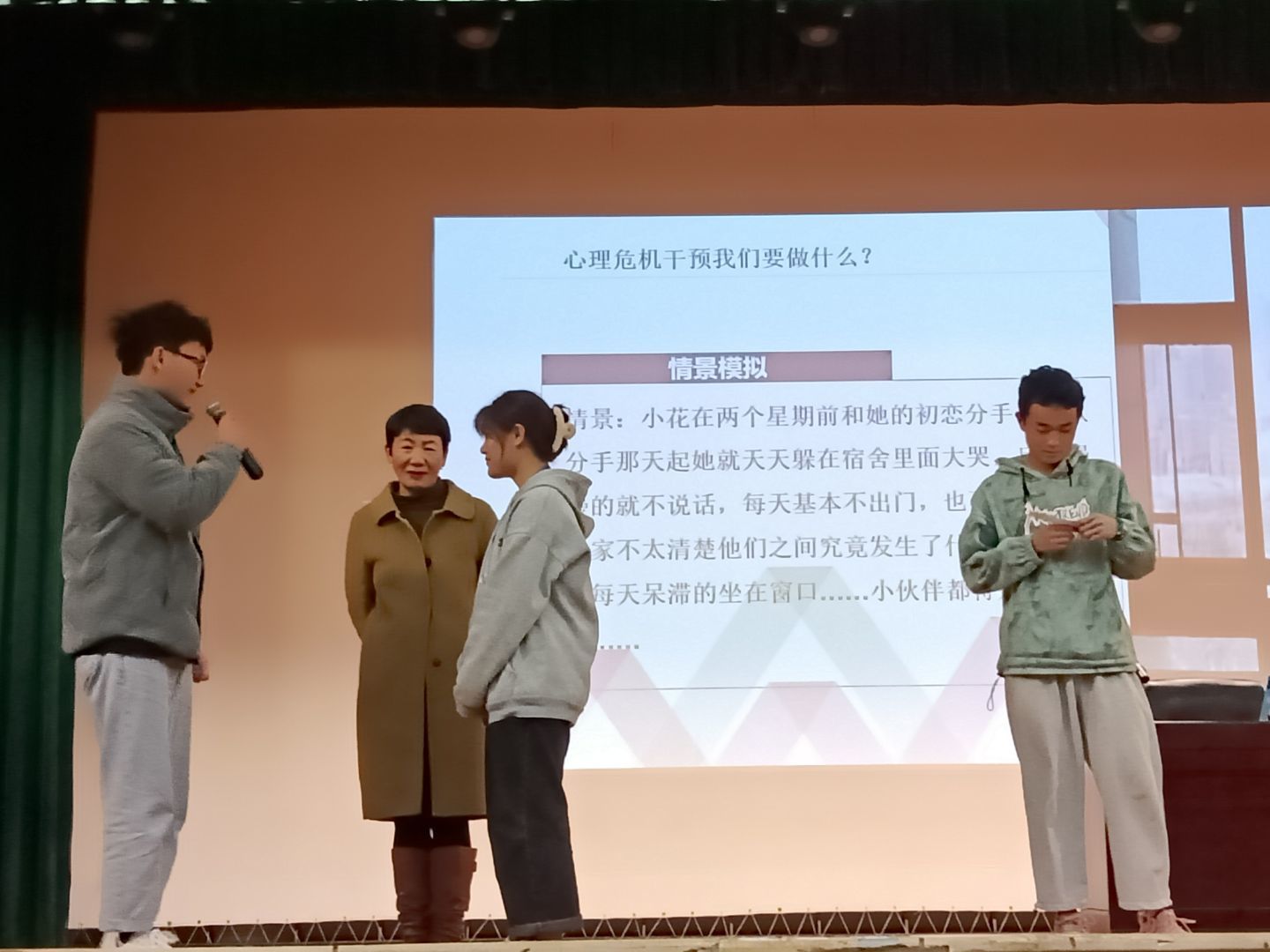 陈老师以歌曲《曾经我也想过一了百了》为导入,从“认识与了解心理危机”、“如何识别老员工心理危机”和“老员工心理危机的应对方法”三个部分,向同学们系统讲解了心理危机信号识别、紧急心理危机情况的干预流程和注意事项,求助的资源和途径等内容,让同学们对心理危机有了基本的认识,学会识别身边潜在的危险信号,同时通过现场情境模拟的方式,形象深刻的让同学们领会和掌握处理紧急情况的方法。