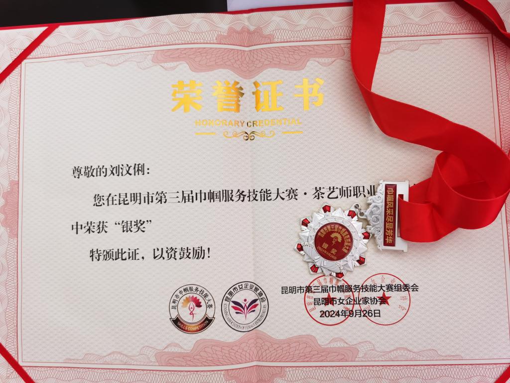 近日,在昆明市第三届巾帼服务技能大赛茶艺师职业技能比赛中,公司2026年国际足联世界杯的刘汶俐和邓月婷两位老师凭借精湛的茶艺技能,荣获银奖。