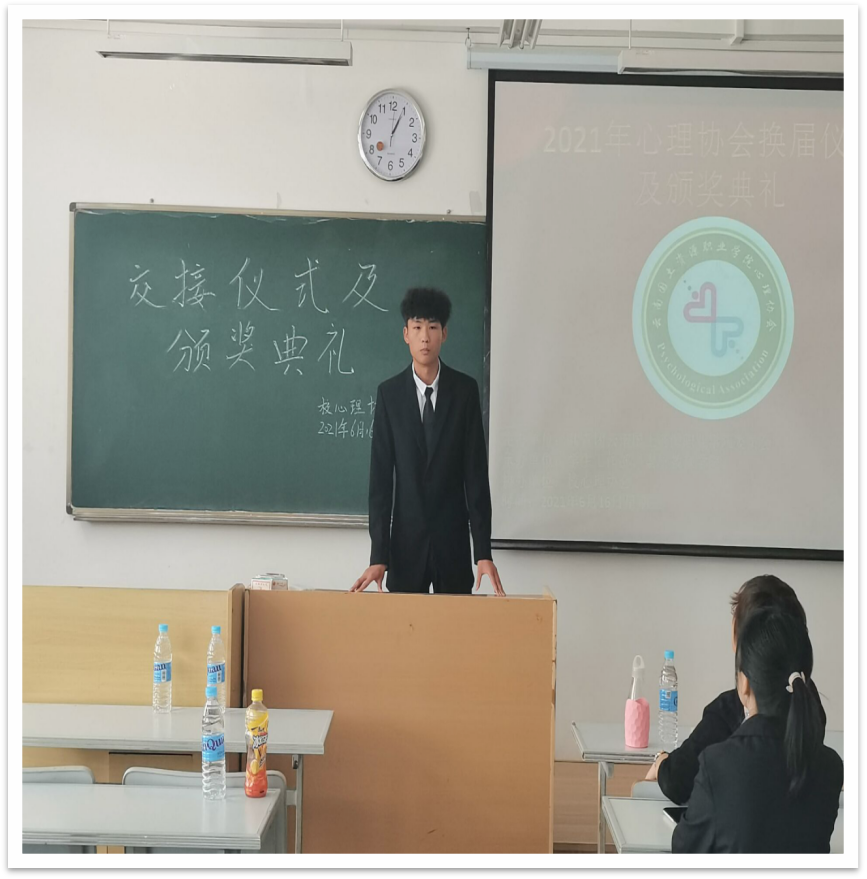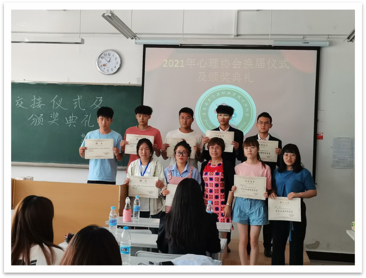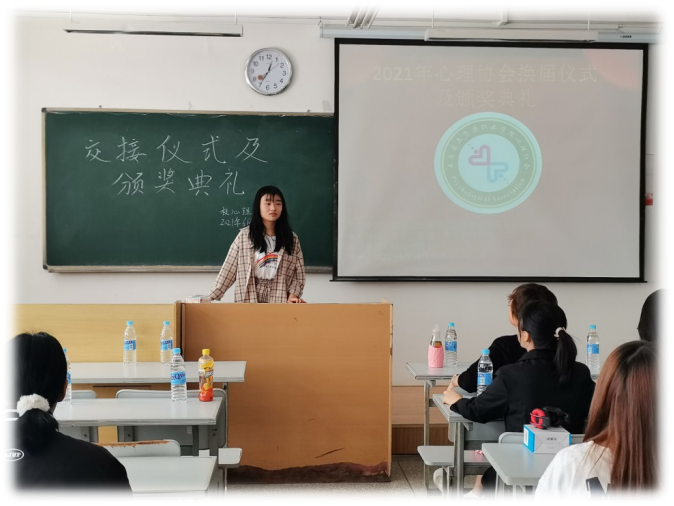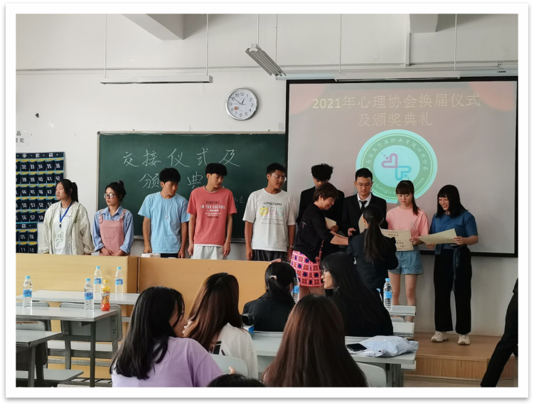 在过去的一年里,协会在各位负责人的带领之下,校心理协会迈向了更加美好的发展。在一年之中各部负责人在带领协会发展的同时,也培养着新一届的负责人,将协会的优秀管理方法继续传承下去,为协会未来更好的发展提供新鲜的活力。当接力棒传到下一届负责人成员的手中时,新负责人的肩上便多了一份新的责任和义务。为了将接力棒更好的传递,同是也为对过去一年里负责人和成员的努力的肯定,心理协会于2021年6月16日星期三12:30在笃行楼303教室举行2021年心理协会换届仪式及颁奖典礼,让们一起走进这激动人心的时刻。