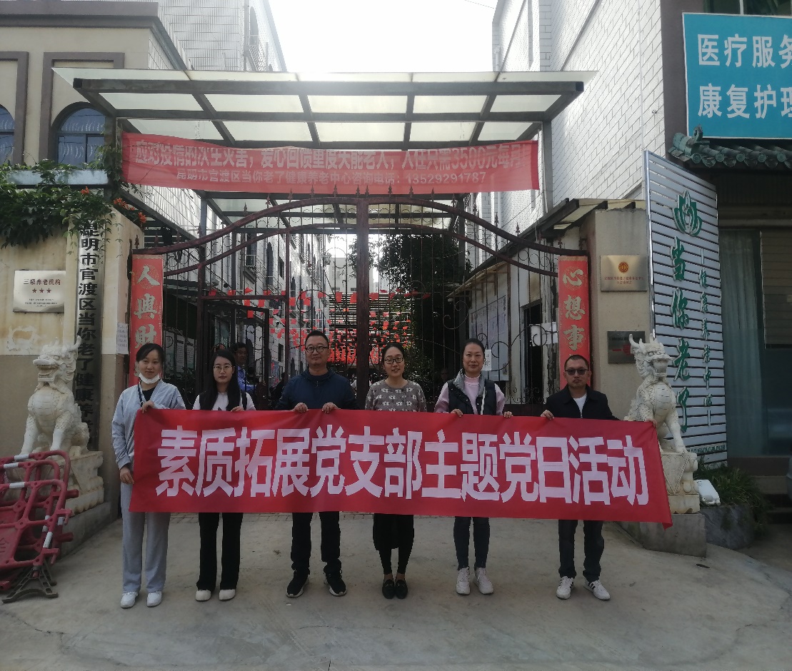 为倡导“敬老、爱老、助老”的社会风尚,弘扬中华民族传统美德,进一步开展“我为群众办实事”实践活动,在重阳节来临之际,10月22日,素质拓展党支部到当你老了健康养老中心开展敬老、爱老、助老”主题党日活动,素质拓展党支部全体党员参加活动。