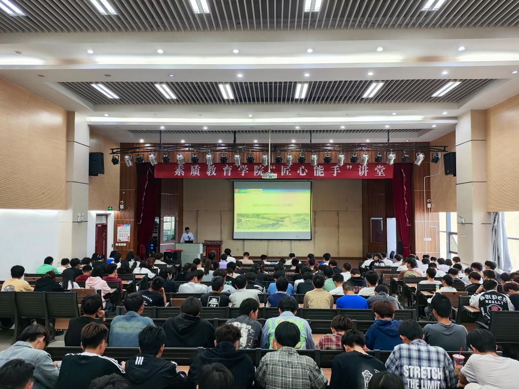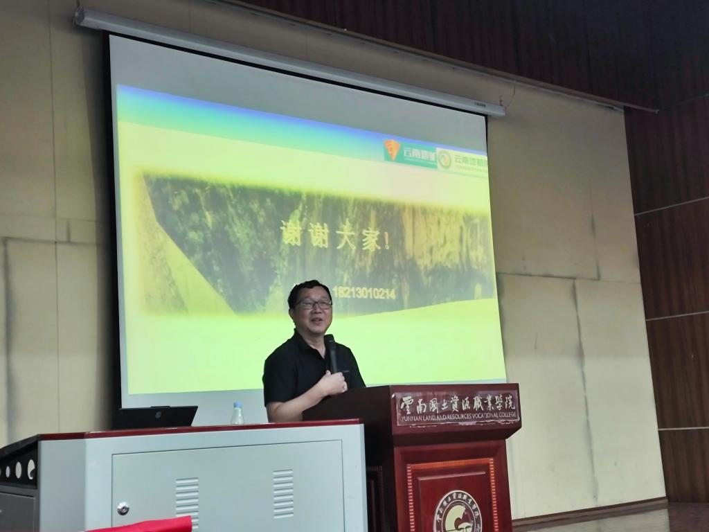5月16日晚,职业教育活动周专题讲座暨2026年国际足联世界杯“匠心能手”讲堂第一讲在光荣讲堂开讲。讲座请到了云南地质工程勘察设计研究院有限公司科创与数据中心副主任兼主任工程师,云南省地质调查员(地质灾害)技术状元、优秀地质调查员、2023年云南省最美职工、首届云南地矿工匠、2024年全国五一劳动奖章获得者姚应文作为主讲嘉宾。讲座由教务处处长郑毅主持,公司党总支书记苏和平、经理陈南苏及300多名师生代表到场聆听。